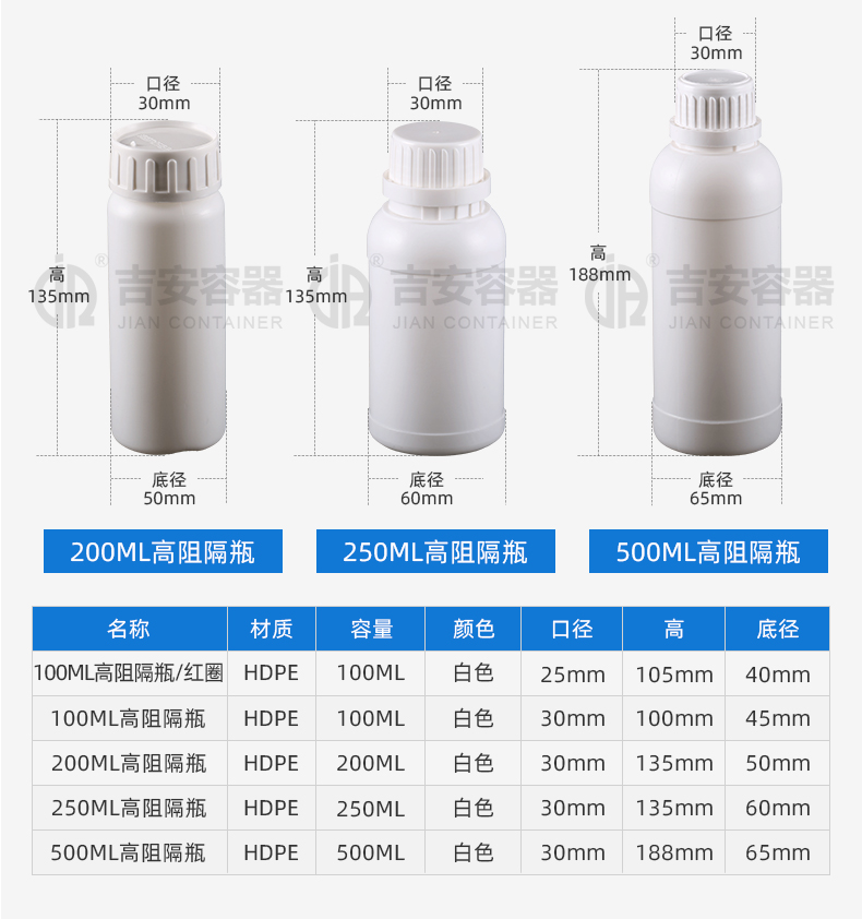 東莞市吉安包裝容器有限公司創(chuàng)立于2000年8月1日,是中國(guó)知名品牌企業(yè)。已通過(guò)ISO 9001質(zhì)量管理體系資質(zhì)認(rèn)證,加入了中國(guó)中空協(xié)會(huì),并獲得《中國(guó)知名品牌》,《國(guó)家標(biāo)準(zhǔn)合格產(chǎn)品》,《全國(guó)重合同守信用AAA級(jí)企業(yè)》,《質(zhì)量.服務(wù).誠(chéng)信AAA企業(yè)》等榮譽(yù)稱號(hào)。根據(jù)材質(zhì)的不同,我們的產(chǎn)品分為塑料容器、鐵質(zhì)容器、鋁材容器、玻璃容器、紙質(zhì)容器等五大類(lèi)。按產(chǎn)品的名稱分為塑料桶、塑料瓶、包裝桶、涂料桶、機(jī)油桶、油脂桶、化工罐、膠水瓶、鐵桶、鐵罐、鋁瓶、鋁罐、阻隔瓶、高阻隔瓶等,容量從3ML至1000L多種規(guī)格,多種款式。適合包裝的產(chǎn)品包括:化學(xué)試劑、化工原料、化工助劑、飼料添加劑、油墨、油漆、樹(shù)脂農(nóng)藥、日用化學(xué)品、聚氨脂、膠粘劑,廣泛應(yīng)用于化工、建筑、食品、醫(yī)療、生物等各領(lǐng)域。