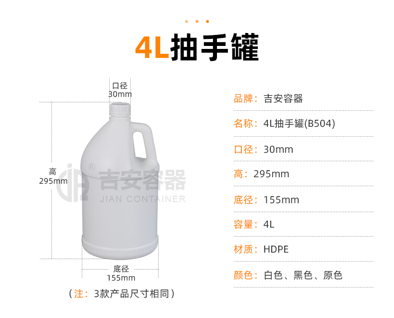 東莞市吉安包裝容器有限公司創(chuàng)立于2000年8月1日,是中國知名品牌企業(yè)。已通過ISO 9001質量管理體系資質認證,加入了中國中空協(xié)會,并獲得《中國知名品牌》,《國家標準合格產品》,《全國重合同守信用AAA級企業(yè)》,《質量.服務.誠信AAA企業(yè)》等榮譽稱號。根據(jù)材質的不同,我們的產品分為塑料容器、鐵質容器、鋁材容器、玻璃容器、紙質容器等五大類。按產品的名稱分為塑料桶、塑料瓶、包裝桶、涂料桶、機油桶、油脂桶、化工罐、膠水瓶、鐵桶、鐵罐、鋁瓶、鋁罐、阻隔瓶、高阻隔瓶等,容量從3ML至1000L多種規(guī)格,多種款式。適合包裝的產品包括:化學試劑、化工原料、化工助劑、飼料添加劑、油墨、油漆、樹脂農藥、日用化學品、聚氨脂、膠粘劑,廣泛應用于化工、建筑、食品、醫(yī)療、生物等各領域。